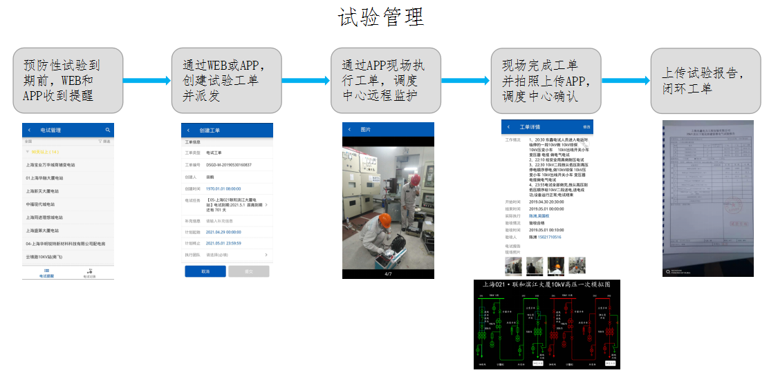 試驗(yàn)管理試驗(yàn)管理,用于預(yù)防性試驗(yàn)流程管控,支持試驗(yàn)到期提醒、工單派發(fā)、以及電試報(bào)告的關(guān)聯(lián)存儲(chǔ),提升電站運(yùn)行管理水平。